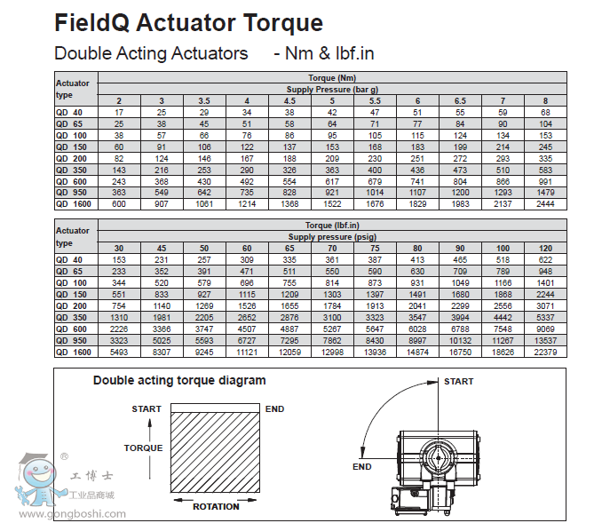 FieldQ 完全一體化的氣動執行機構控制閥門的開和關,無論是單作用還是雙作用,它的可靠扭矩輸出范圍為354in-lbs到14160in-lbs(40Nm-1600Nm)。