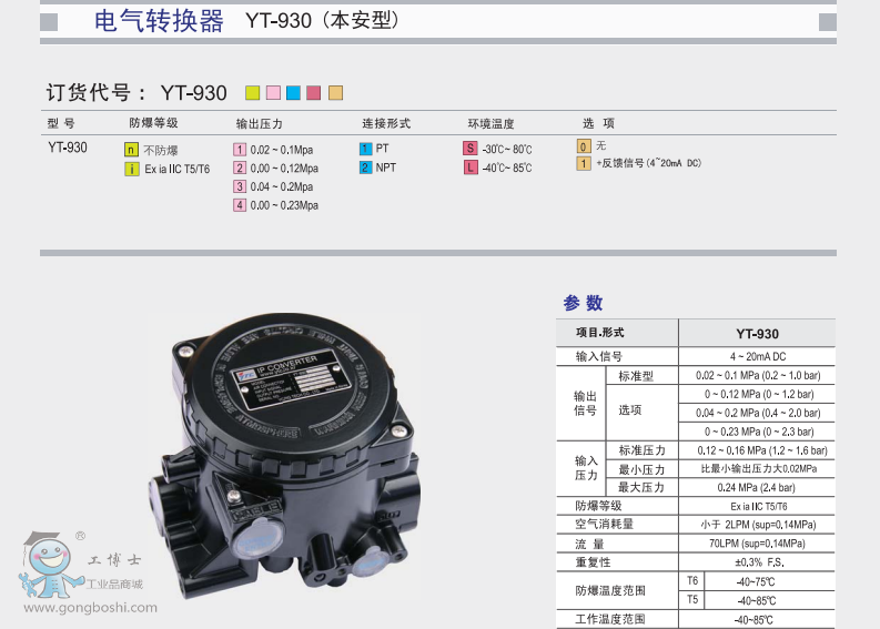 電氣轉換器YT-940系列產品是從控制室接收4~20mA電流信號,按比例轉換成氣壓信號的裝置。
