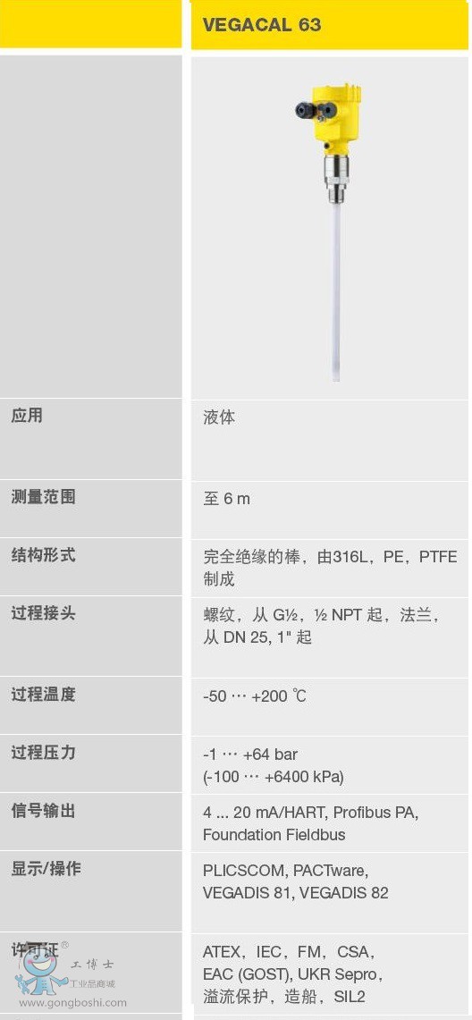 VEGACAL 系列的牢固的物位傳感器被用于那些具有穩定的電測量條件的固料和均質液體的物位測量。 儀表采用完全絕緣的結構形式,既可測量腐蝕性液體也可測量嚴重粘附的介質。 對于固料優先使用部分絕緣的結構形式。