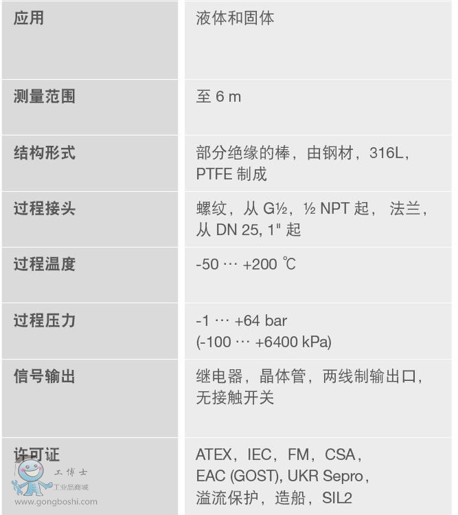 VEGACAP 系列的限位傳感器被用于那些具有穩定的電測量條件的容器和管道中的均質液體和固料。 它們的作用是溢流保護,干運行保護,油/水探測以及泡沫探測。 在液體中主要采用完全絕緣的結構形式。 它們可以在侵蝕性液體或粘附嚴重的介質中測量限位。 在固料中優先使用部分絕緣的結構形式。