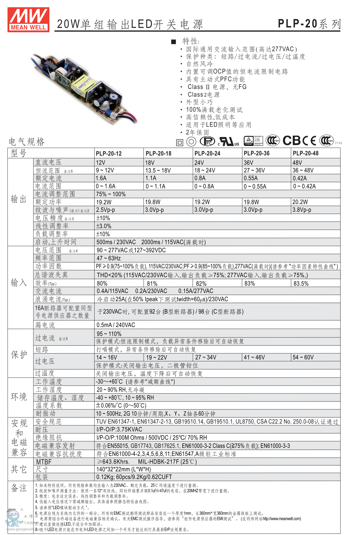 臺灣明緯LED開關電源PLP-20-48 20w48V0.42A |