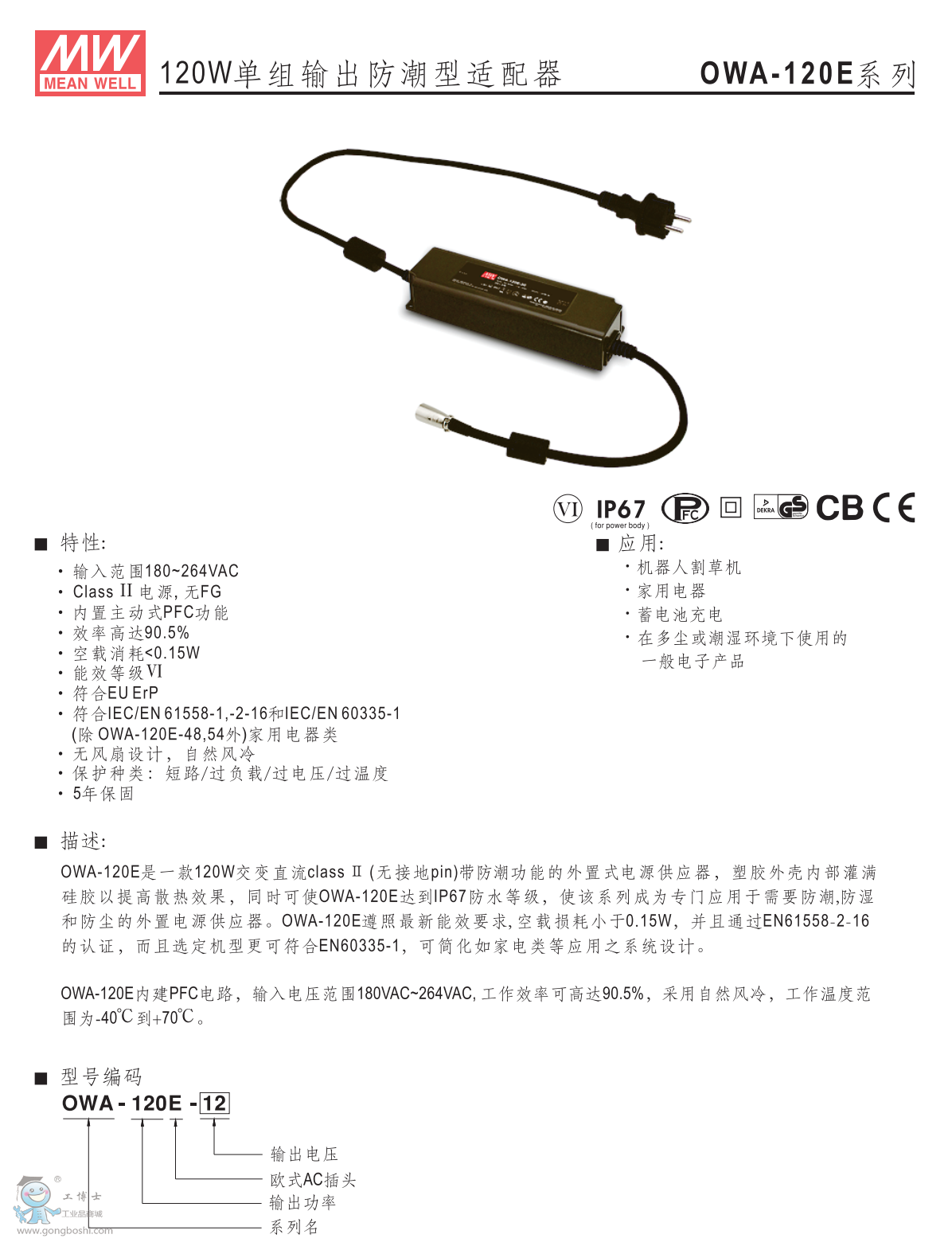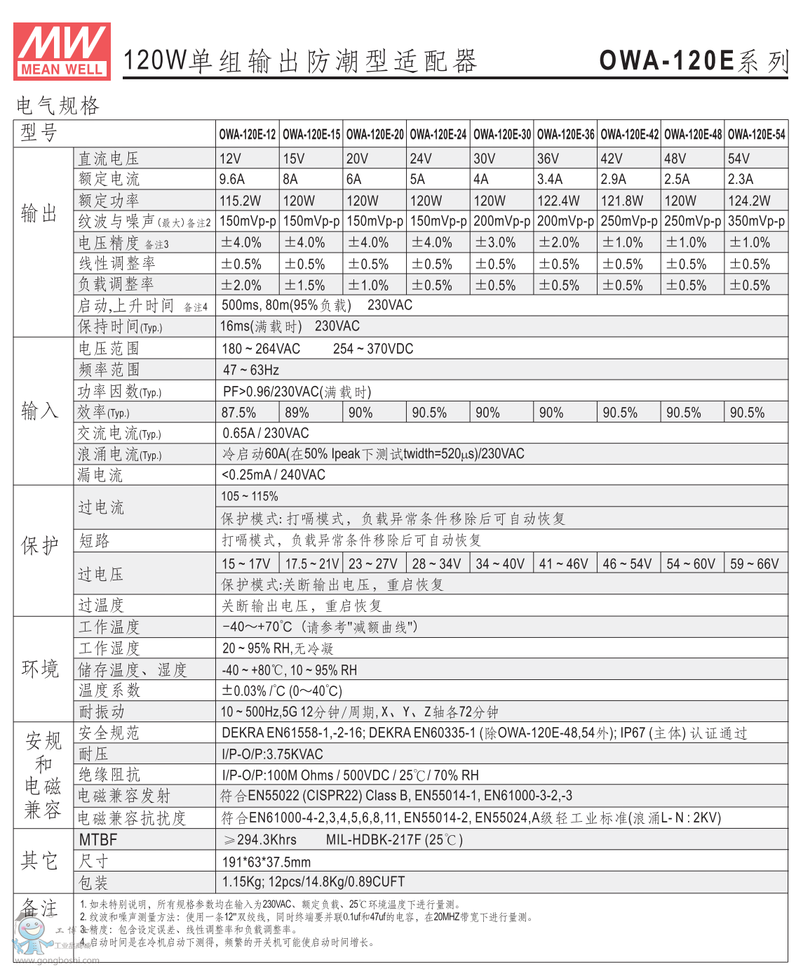 90~264VAC交流輸入(OWA-120E為180~264VAC交流輸入)