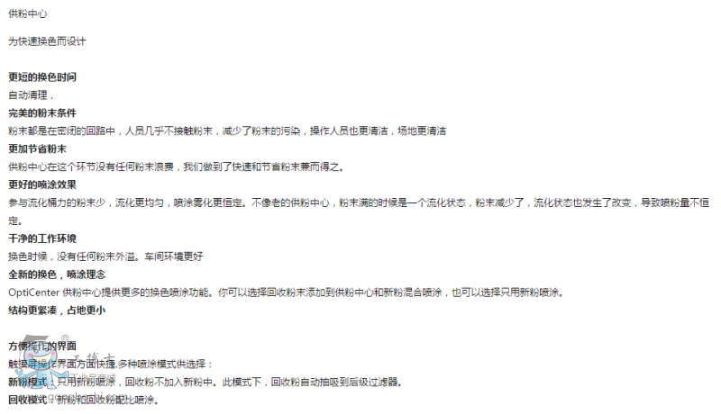 更大的粉桶型號(hào)應(yīng)用靈活,換色迅速,結(jié)合采取便利的模塊化概念的OptiSpray粉泵創(chuàng)造了極佳的噴涂效果。