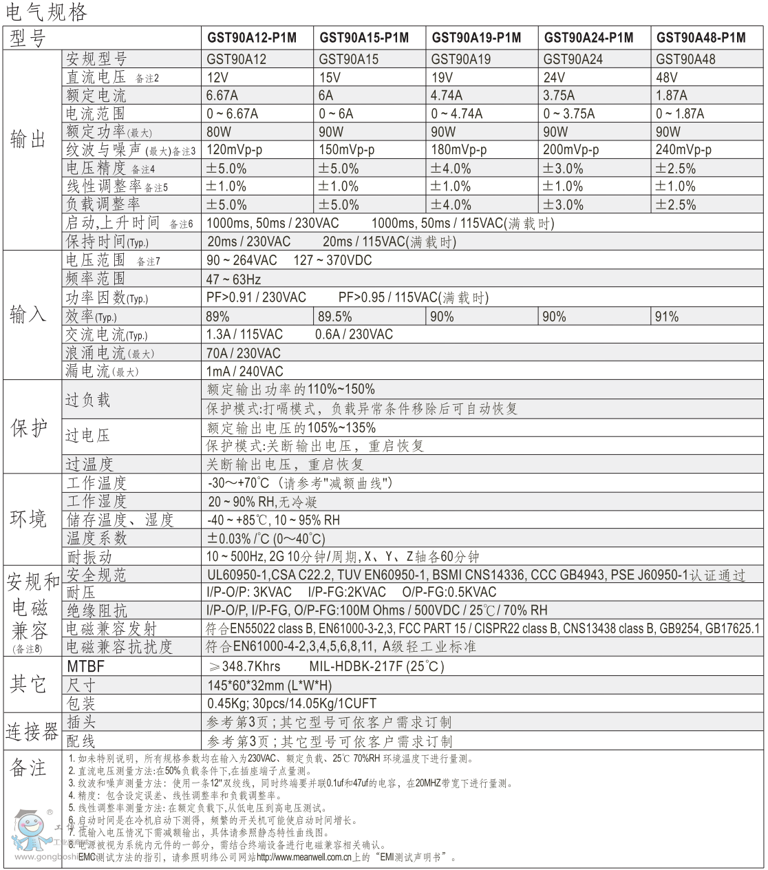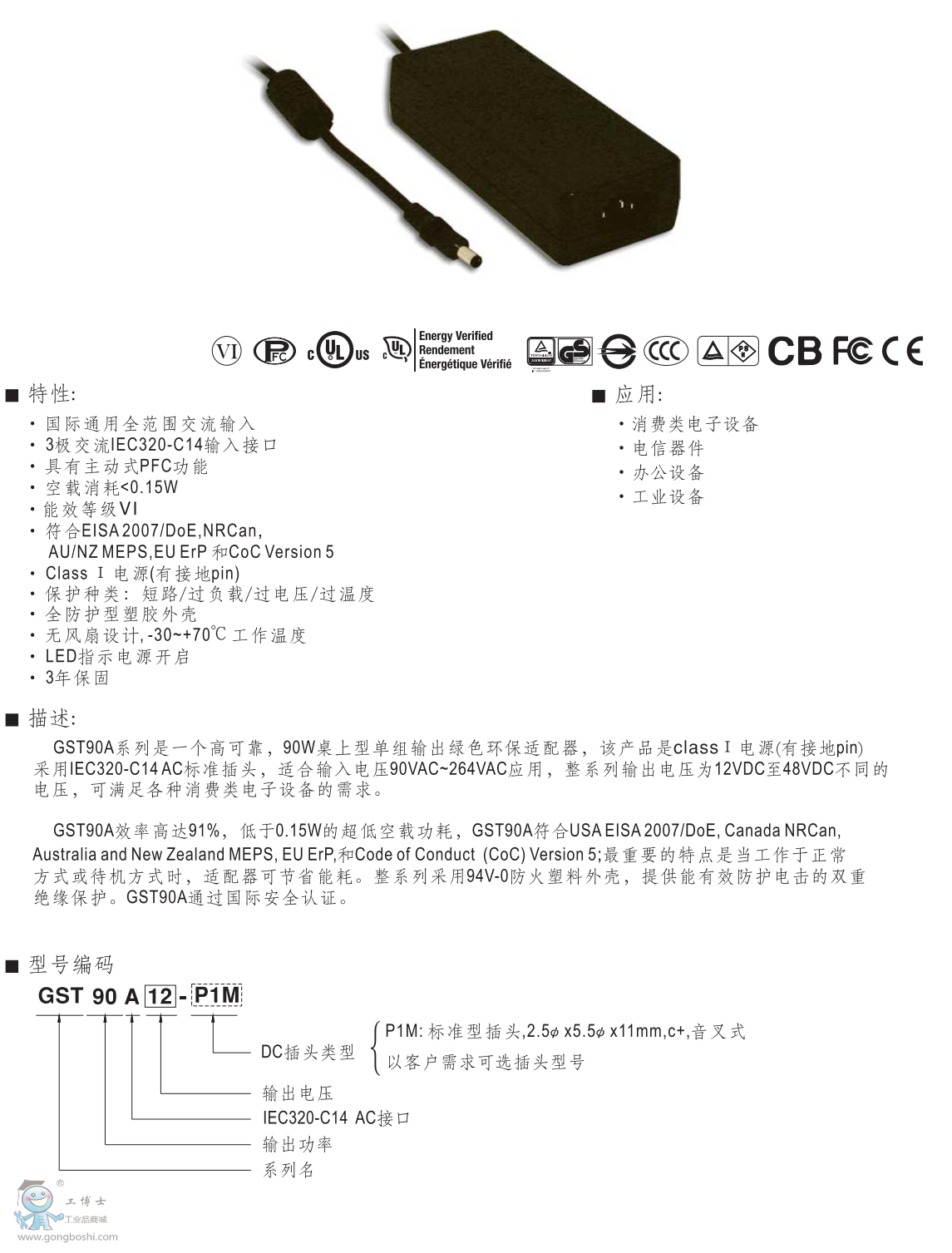 明緯工業(yè)用電源適配器GST90A12-P1M標準插頭 |