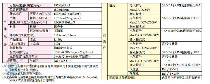 特點:●豐富的通用功能 可任意選擇電氣信號(容量與接點個數(shù))和氣壓孔(尺寸與個數(shù))。 ●無接觸的吸合方式 裝配作業(yè)時,不會使主盤與工具盤接觸,通過這種吸合方式漠視偏心。 ●機械式故障保險機構 本公司獨有的拆裝機構中采用了機械式故障保險機構,使裝配氣壓停 止供給的情況下,主盤與工具盤也不會分離。