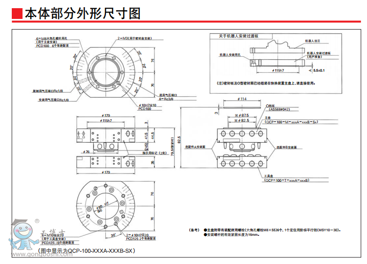 QCP-100是在沖壓自動化搬送時,對抓取沖壓部件的端拾器系統進行更換的『末端自動交 換裝置』。針對工具盤選配,可選無連接器的電氣信號模塊,該模塊更便于設定ID檢測,并配有保護罩。