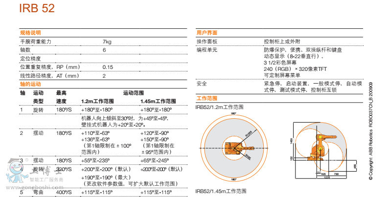 IRB 52體形小巧,工作范圍寬大,柔性與通用性俱佳,且其操作速度快、精度高,周期時間短。