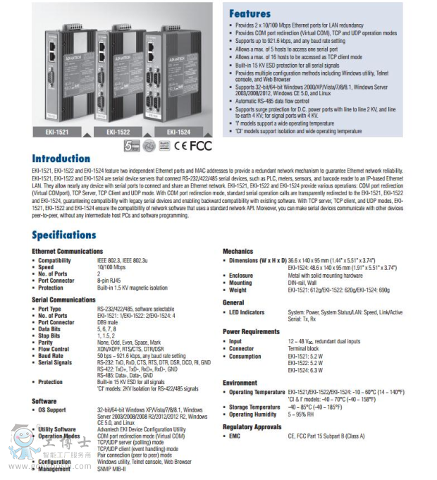 EKI-1521, EKI-1522 及EKI-1524 具備兩個獨立的以太網口和MAC 地址,可以提供冗余網絡機制,保證了以太網的可靠性。 EKI-1521, EKI-1522 及EKI-1524 是支持RS-232/422/485 的串口設備聯網服務器,例如將PLC、儀表、傳感器和掃描器等設備聯入基于TCO/IP的以太網。他們允許幾乎所有帶串口的設備接入并共享以太網絡。
