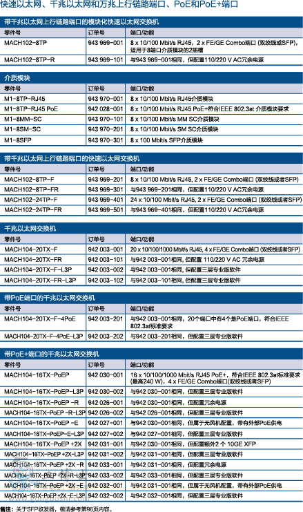 MACH100系列交換機提供多種版本,帶有8,20或者24個固定10/100Bbit/s RJ45以太網(wǎng)端口,或者帶有8個固定端口和額外模塊插槽的模塊化交換機(帶有2個額外的8端口熱插拔端口模塊)。所有版本的產(chǎn)品都提供可以連接到網(wǎng)絡(luò)核心的RJ45/SFP Combo端口。也可提供帶有24個10/100/1000端口的千兆版本產(chǎn)品。