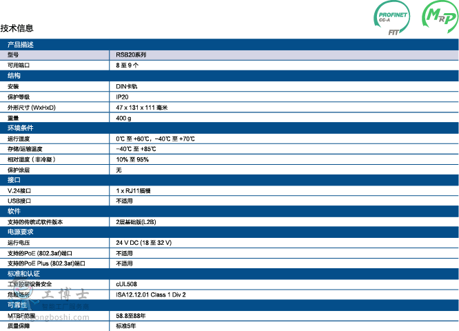 RSB20系列網管型交換機由8個核心模型組成,每一個都可以選擇高溫配置和/或預配置IGMP監聽,出廠時開啟(組播過濾),以提供Ether/IP使用。這些交換機可以提供冗余直流電源輸入和多種多模(MM)、單模(SM)和SFP插槽選型。