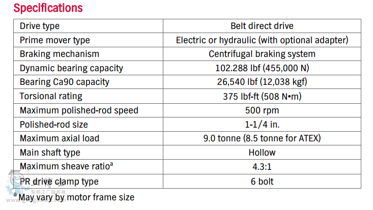 The Weatherford MG-375 is an electric, belt-driven drive with a torque capacity of 375 lbf-ft. It is compatible with Weatherford stuffing boxes and various wellhead connections