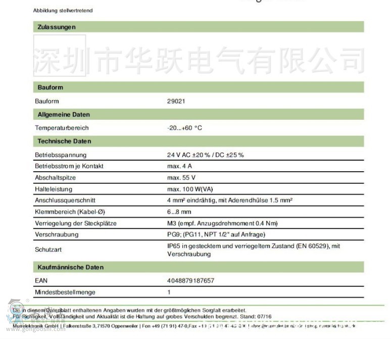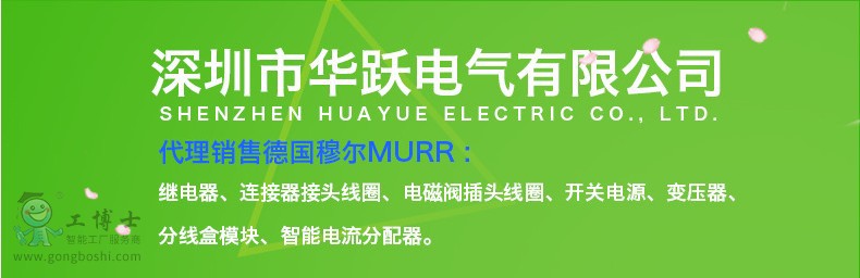 深圳市華躍氣有限公司作為德國穆爾(MURR)授權的一級全線總代理公司。可為客戶提供有競爭力的價格和完備的廠商技術支持。 德國穆爾電子公司(MURRElektronik)于1975年成立于德國歐本威勒,其在工業電子和電氣控制領域處于市場**地位。可為客戶提供各種經現場測試的實用產品與系統,產品廣泛用于機床,原材料處理設備及生產線的控制,測試及監控。