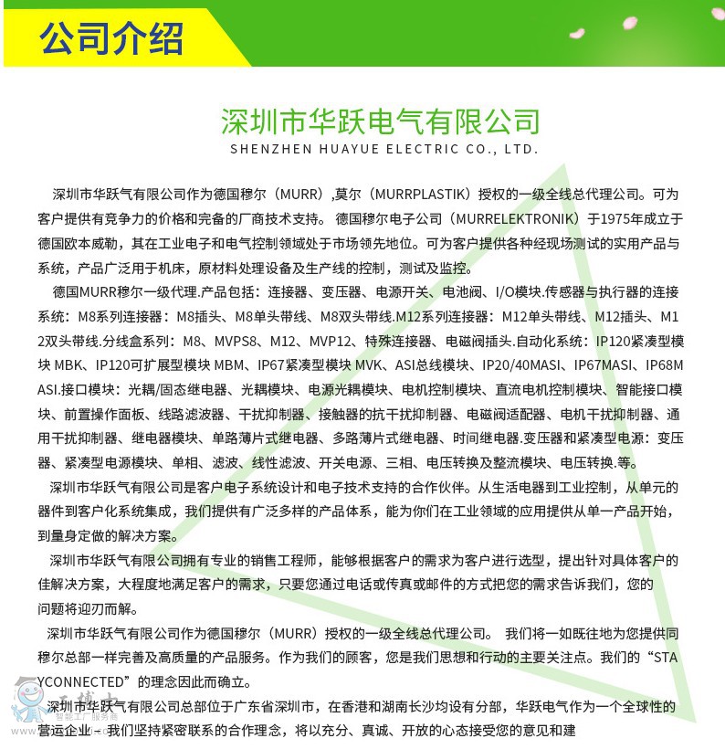 深圳市華躍氣有限公司作為德國穆爾(MURR)授權的一級全線總代理公司。  我們將一如既往地為您提供同穆爾總部一樣完善及高質量的產品服務。作為我們的顧客,您是我們思想和行動的主要關注點。我們的“stayconnected”的理念因此而確立。
