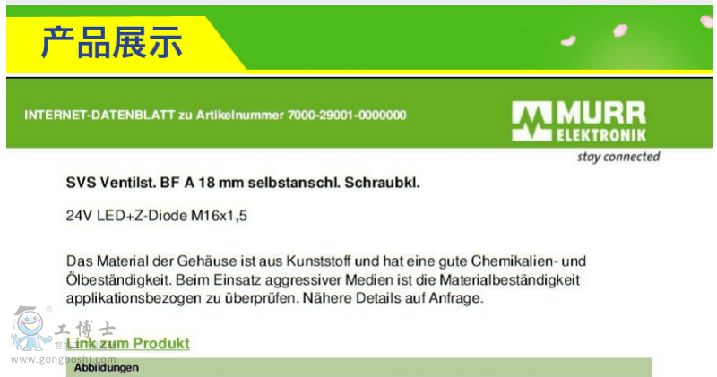 德國MURR穆爾一級代理.產品包括:連接器、變壓器、電源開關、電池閥、I/O模塊.傳感器與執行器的連接系統:M8系列連接器:M8插頭、M8單頭帶線、M8雙頭帶線.M12系列連接器:M12單頭帶線、M12插頭、M12雙頭帶線.分線盒系列:M8、MVPS8、M12、MVP12、特殊連接器、電磁閥插頭.自動化系統:IP120緊湊型模塊 MBK、IP120可擴展型模塊 MBM、IP67緊湊型模塊 MVK、ASI總線模塊、IP20/40MASi、IP67MASI、IP68MASI.接口模塊:光耦/固態繼電器、光耦模塊、電源光耦模塊、電機控制模塊、直流電機控制模塊、智能接口模塊、前置操作面板、線路濾波器、干擾抑制器、接觸器的抗干擾抑制器、電磁閥適配器、電機干擾抑制器、通用干擾抑制器、繼電器模塊、單路薄片式繼電器、多路薄片式繼電器、時間繼電器.變壓器和緊湊型電源:變壓器、緊湊型電源模塊、單相、濾波、線性濾波、開關電源、三相、電壓轉換及整流模塊、電壓轉換.等。