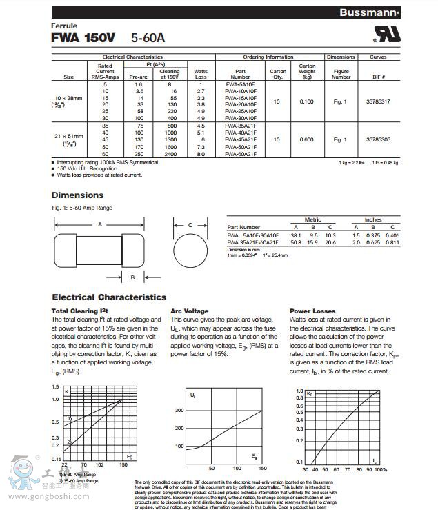 巴斯曼bussmann熔斷器FWA-50A21F圓管型快熔 電流50A電壓150Vac/dc |