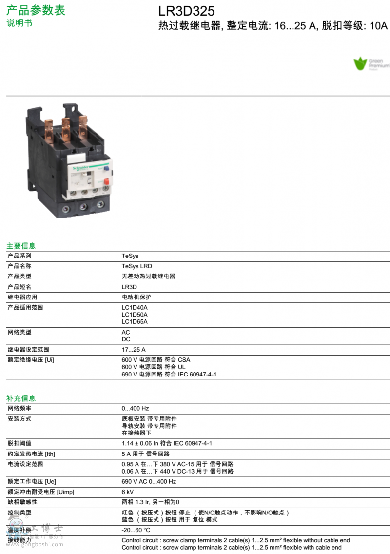 施耐德/Schneider 熱過載繼電器 LR3D325 整定電流:16-25A 脫扣等級:10A