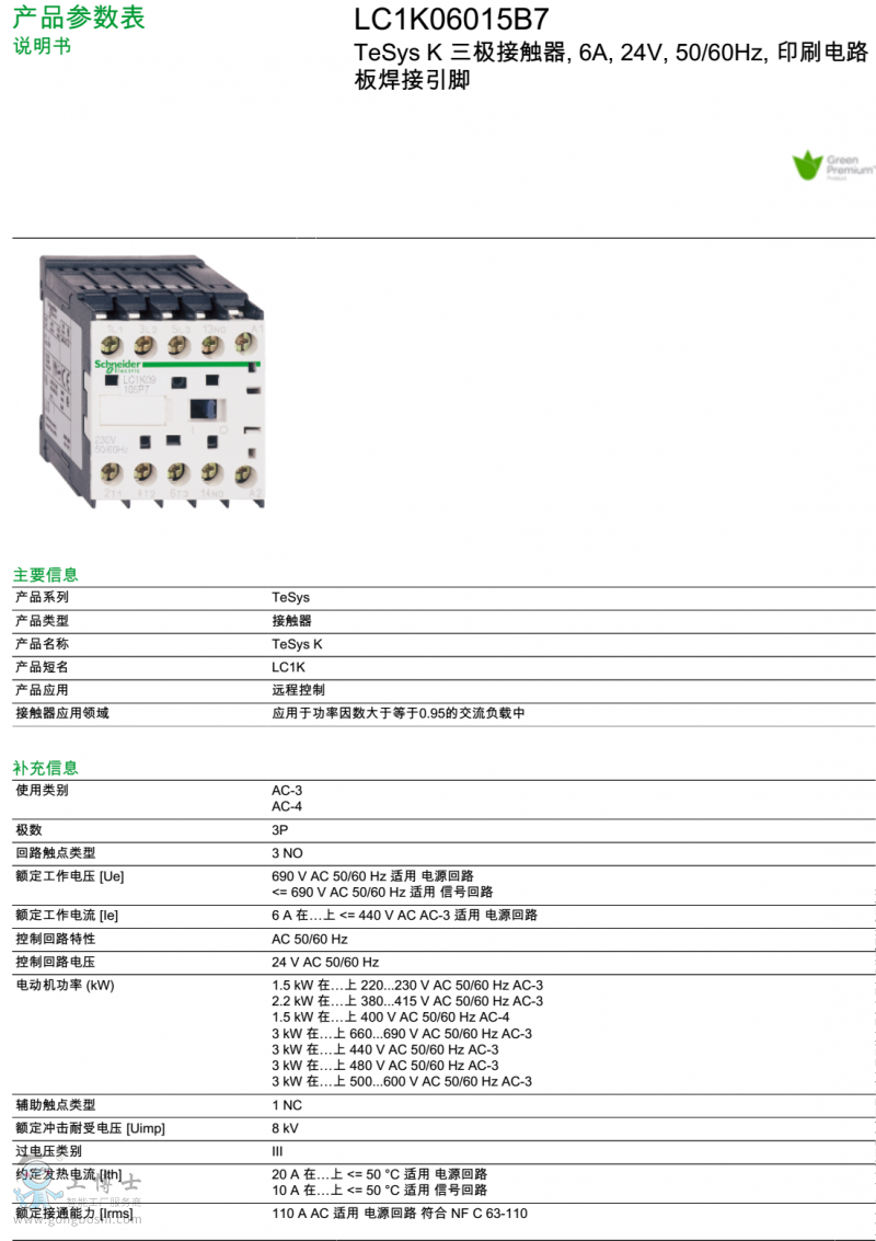 施耐德/Schneider 三極接觸器 LC1K06015B7 6A 24V 50/60HZ
