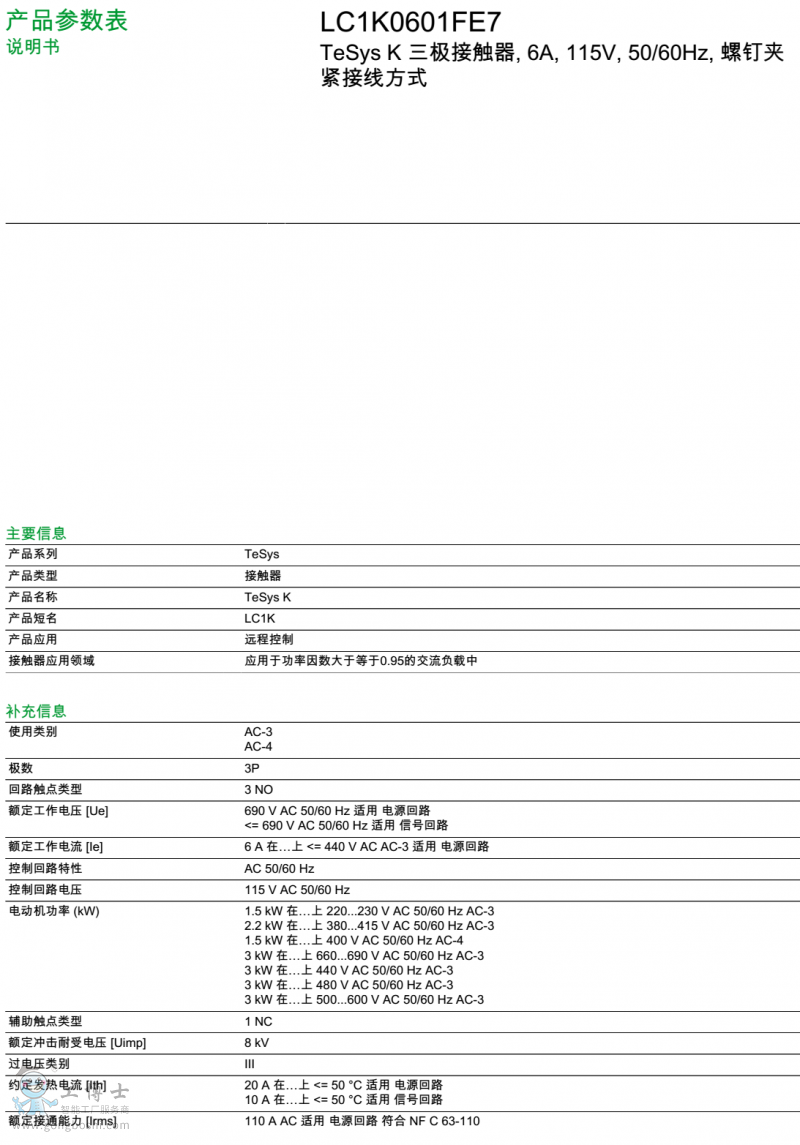 施耐德/Schneider 三極接觸器LC1K0601FE7 6A 115V 50/60HZ