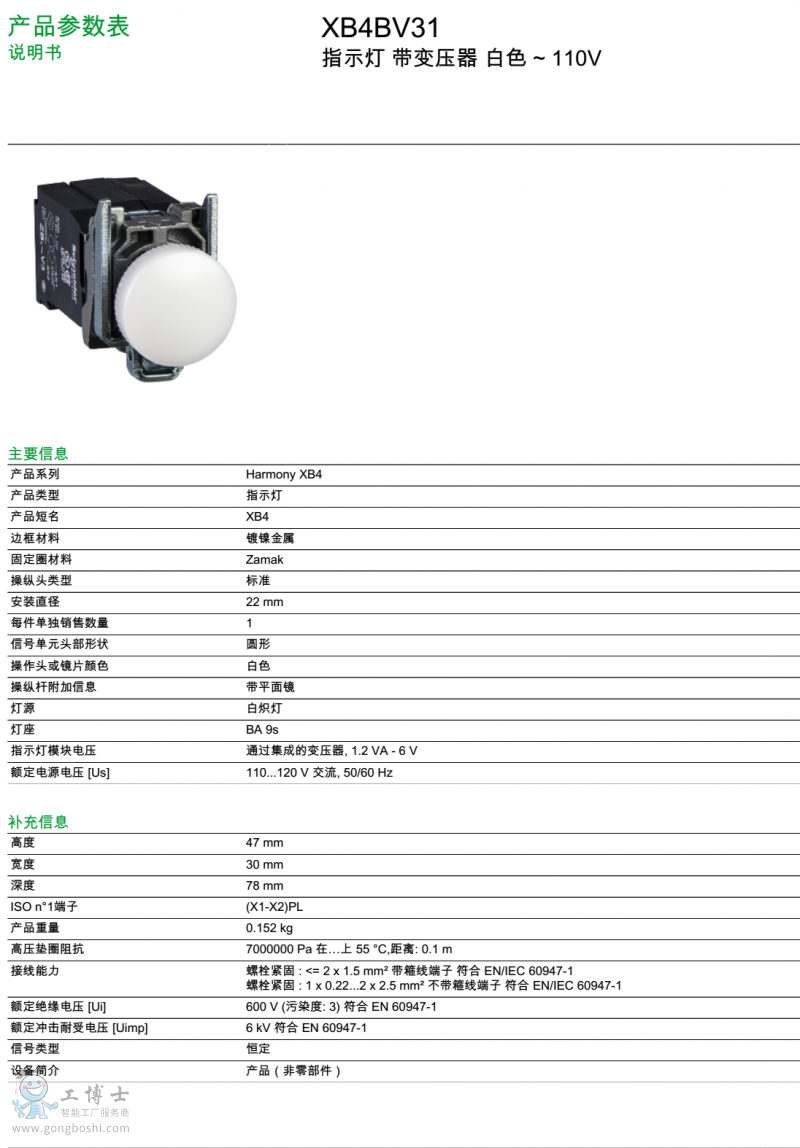 施耐德/Schneider 指示燈 XB4BV31 帶變壓器 白色 110V