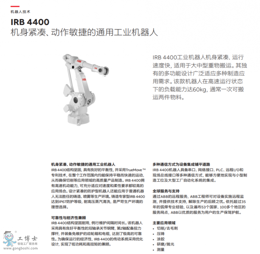 IRB 4400是一種機(jī)身緊湊的機(jī)器人,可承受載荷*高可達(dá)60kg。 除此之外,全能的IRB 4400能勝任各種高精度、高速度和高靈活性的應(yīng)用。