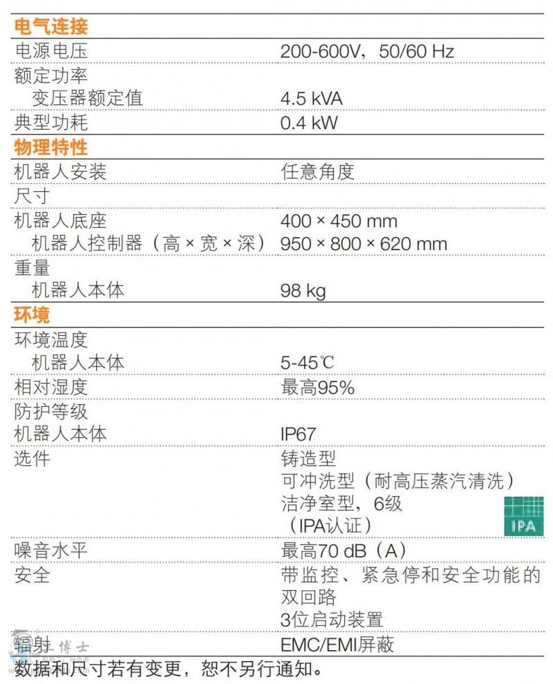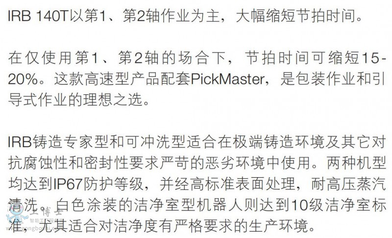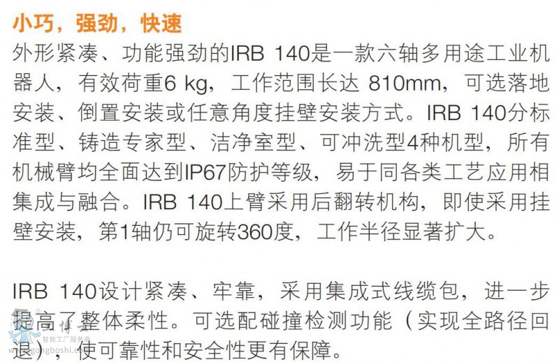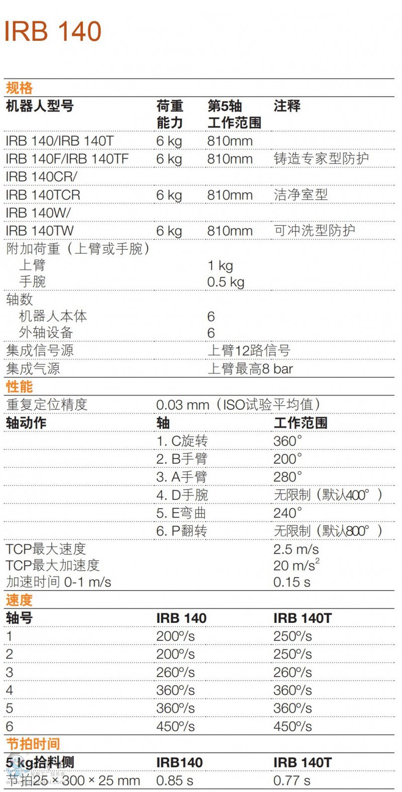 IRB 140分標準型、鑄造專家型、潔凈室型、可沖洗型4種機型,所有 機械臂均全面達到IP67防護等級,易于同各類工藝應用相 集成與融合。