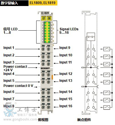 Beckhoff EtherCAT 端子模塊 - EL1809, EL1819 | 高密度 EtherCAT 端子模塊,16 通道數字量輸入,24 V DC 數字量輸入 EL1809, EL1819 信號 LED 1…8 Signal LEDs 9…16 Power contact +24 V Power contact 0 V Input 1 Input 2 Input 3 Input 4 Input 5 Input 6 Input 7 Input 8 Input 9 Input 10 Input 11 Input 12 Input 13 Input 14 Input 15 Input 16 俯視圖 觸點組件 EL1809, EL1819 36o°視圖 EL1809, EL1819 | 高密度 EtherCAT 端子模塊,16 通道數字量輸入,24 V DC EL1808 和 EL1819 數字量輸入端子模塊從執行層采集二進制控制信號,并以電隔離的形式將這些信號傳輸到上層自動化單元。這兩款總線端子模塊都有 16 個通道,其信號狀態通過 LED 顯