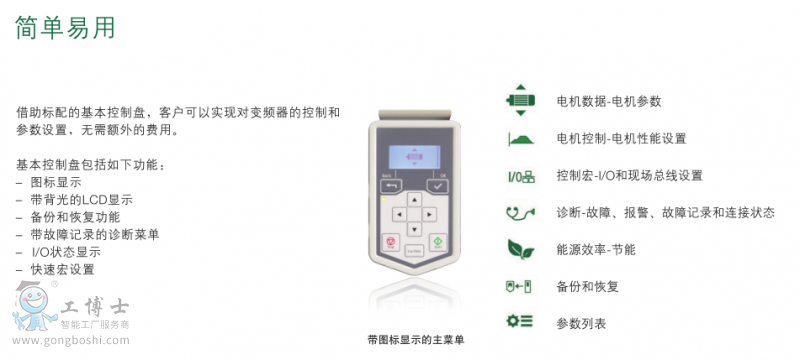 變頻器控制盤基于圖標的菜單有助于您方便快捷的調試變頻器,然