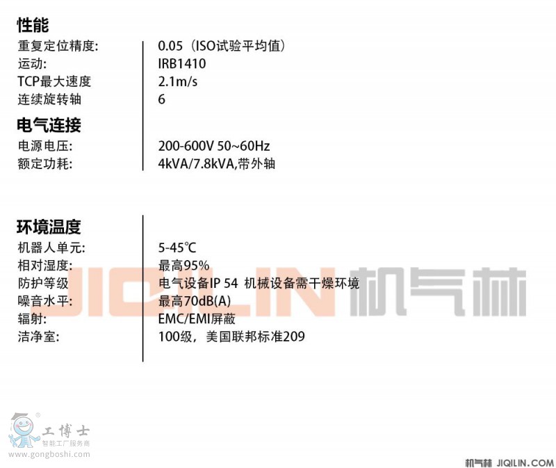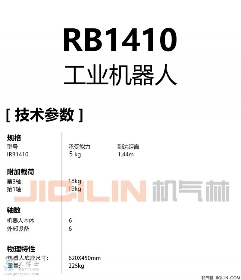 型號:IRB1410 產品配置:機器人本體、IRC5控制柜、示教器及十米示教器線、7米電源線、16入16出IO模塊,選配:InternetIP、Profinet、ProfiBus通信模塊。