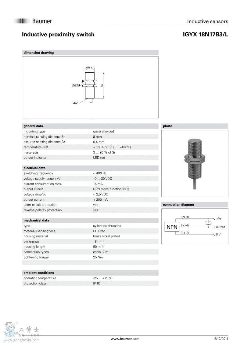 Baumer堡盟電感式接近開關 IGYX 08P17B3/S35L開增值票 |