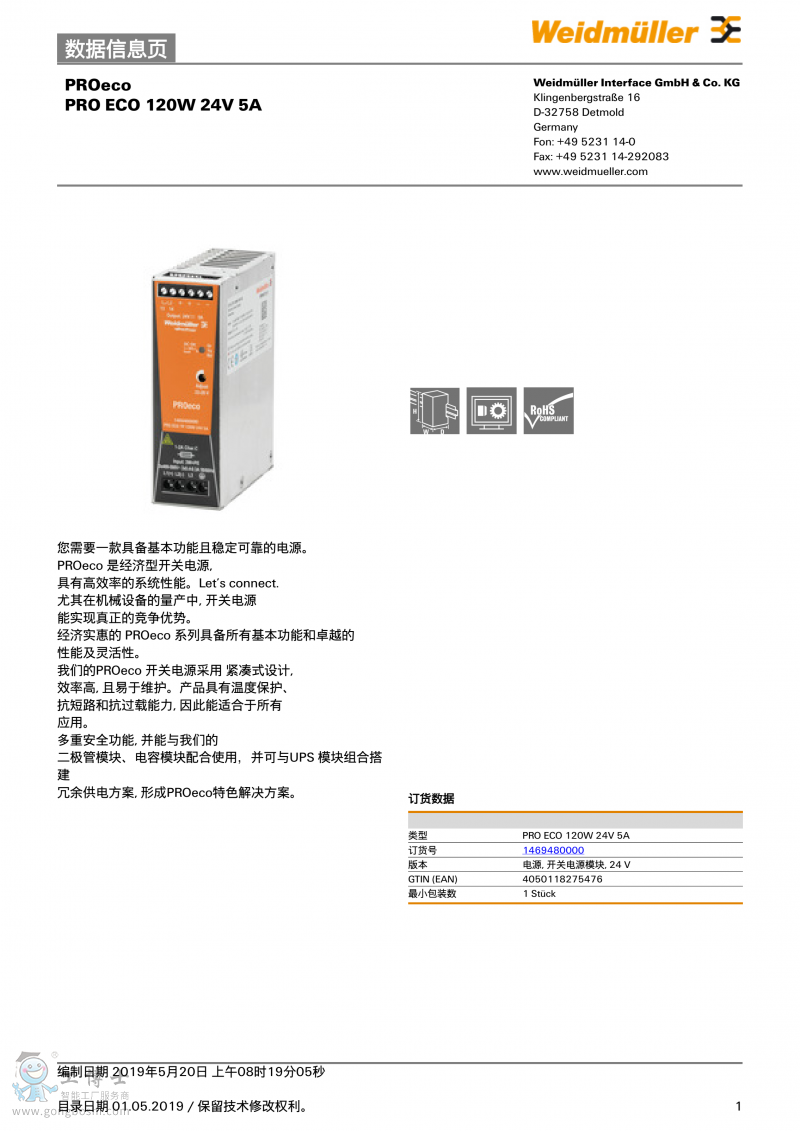 魏德米勒weidmulle開關電源PRO ECO 120W 24V 5A單相1469480000