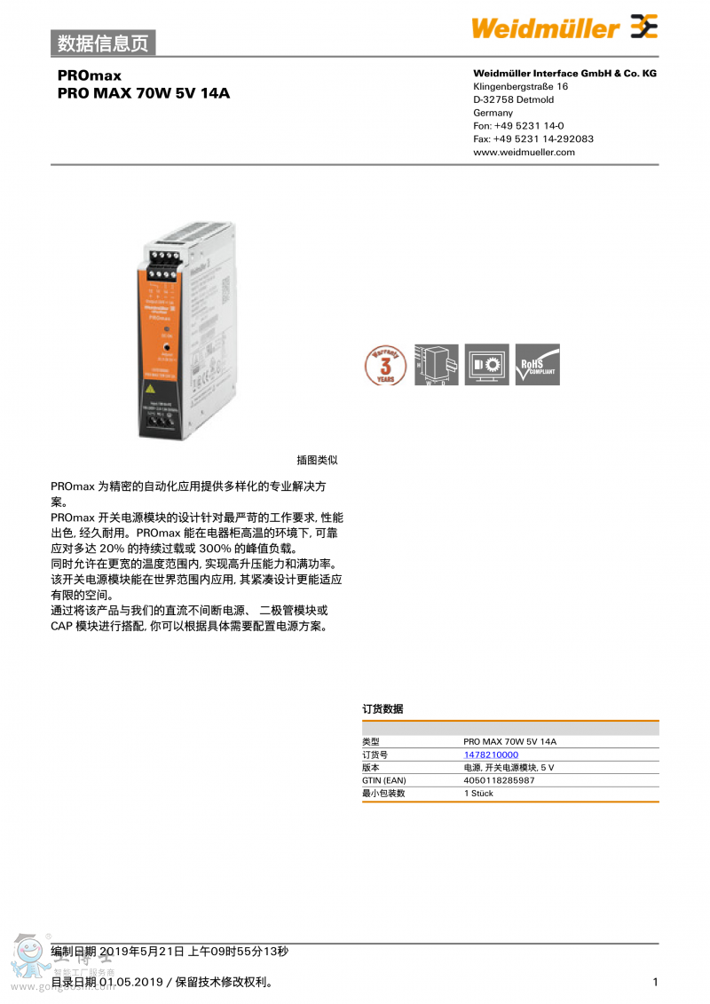 魏德米勒weidmulle開關電源PRO MAX 70W 5V 14A單相1478210000