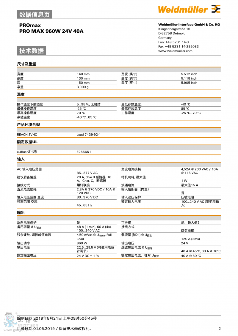 魏德米勒weidmulle開關電源PRO MAX 960W 24V 40A單相1478150000