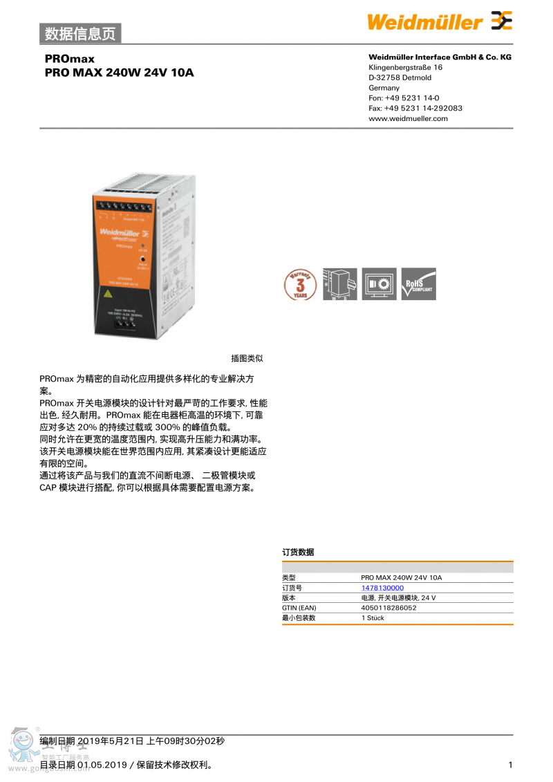 魏德米勒weidmulle開關電源PRO MAX 240W 24V 10A單相1478130000