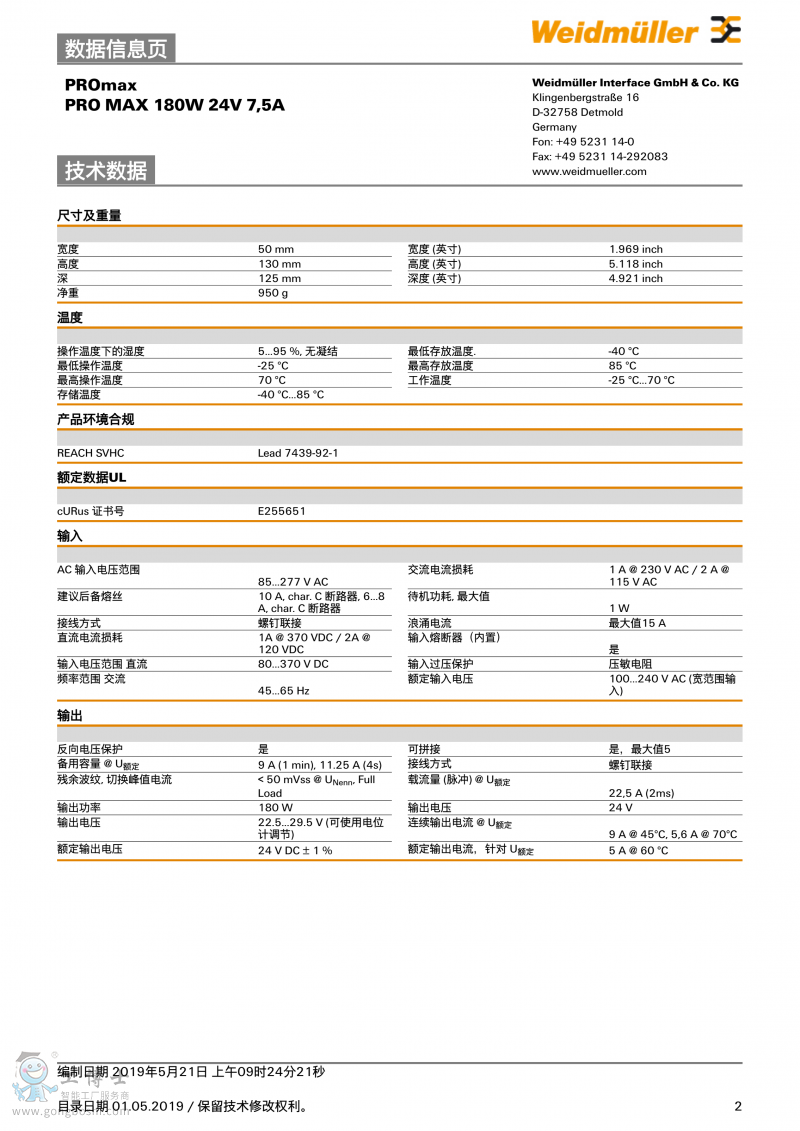 魏德米勒weidmulle電源PRO MAX 180W 24V 7,5A單相1478120000