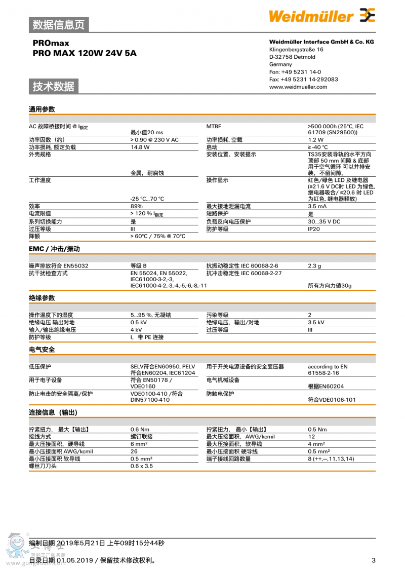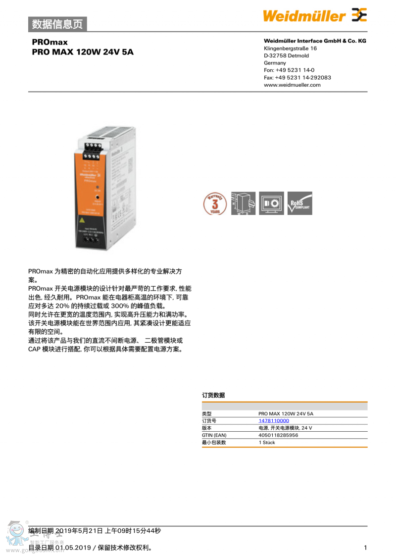 魏德米勒weidmulle開(kāi)關(guān)電源PRO MAX 120W 24V 5A單相1478110000