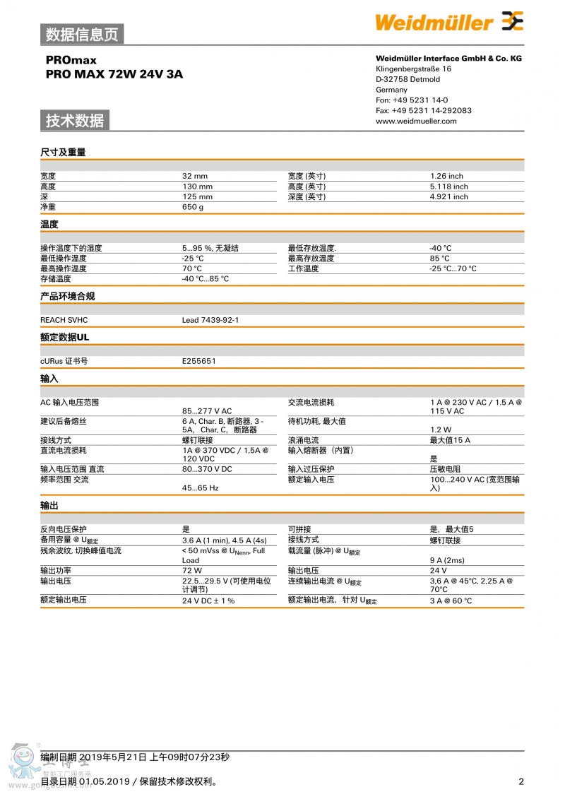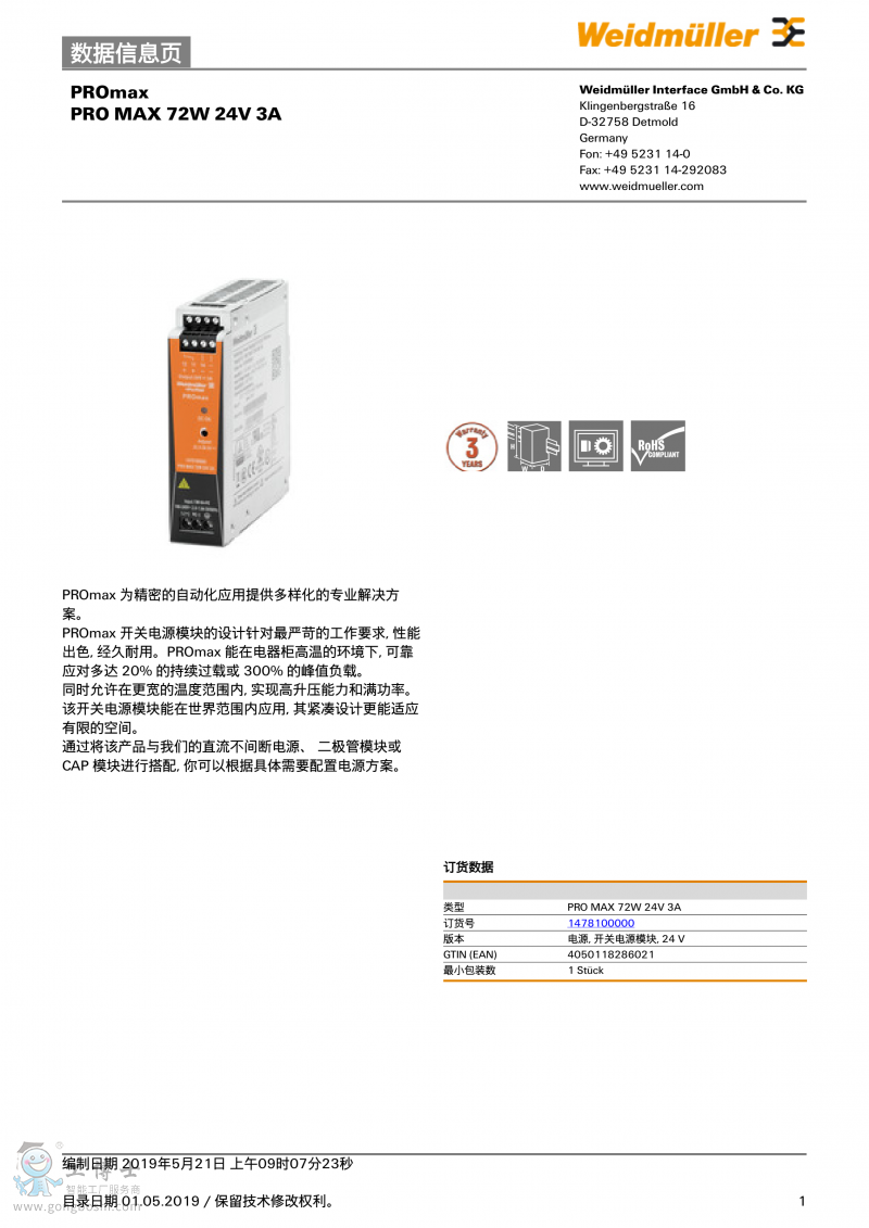 魏德米勒weidmulle開關電源PRO MAX 72W 24V 3A單相1478100000