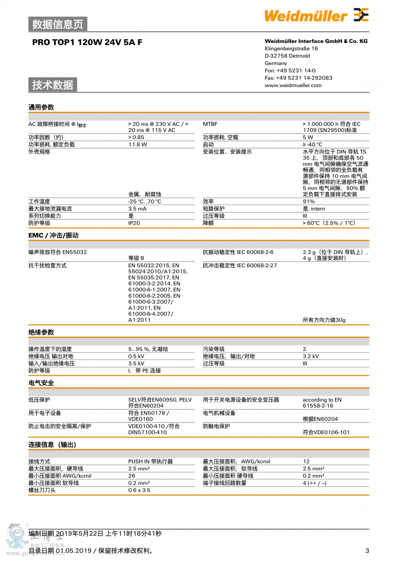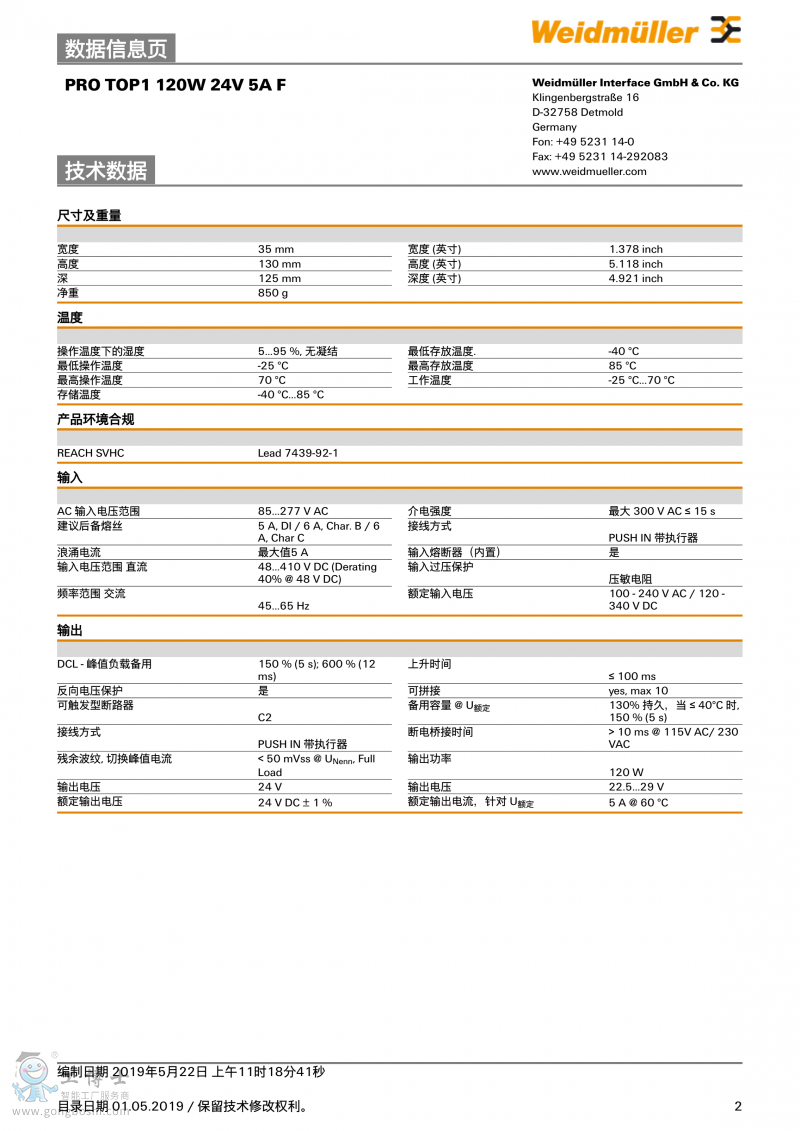 魏德米勒weidmuller電源PRO TOP 120W 24V 5A F單相2568980000