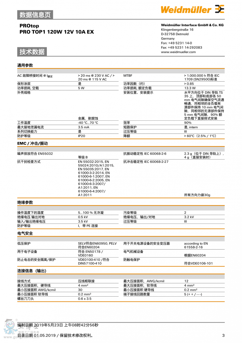 魏德米勒weidmulle電源PROTOP 120W 12V 10A EX單相2467020000