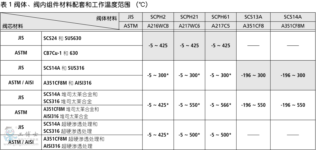 閥體、閥芯材料配套和工作溫度范圍,參考表 1。