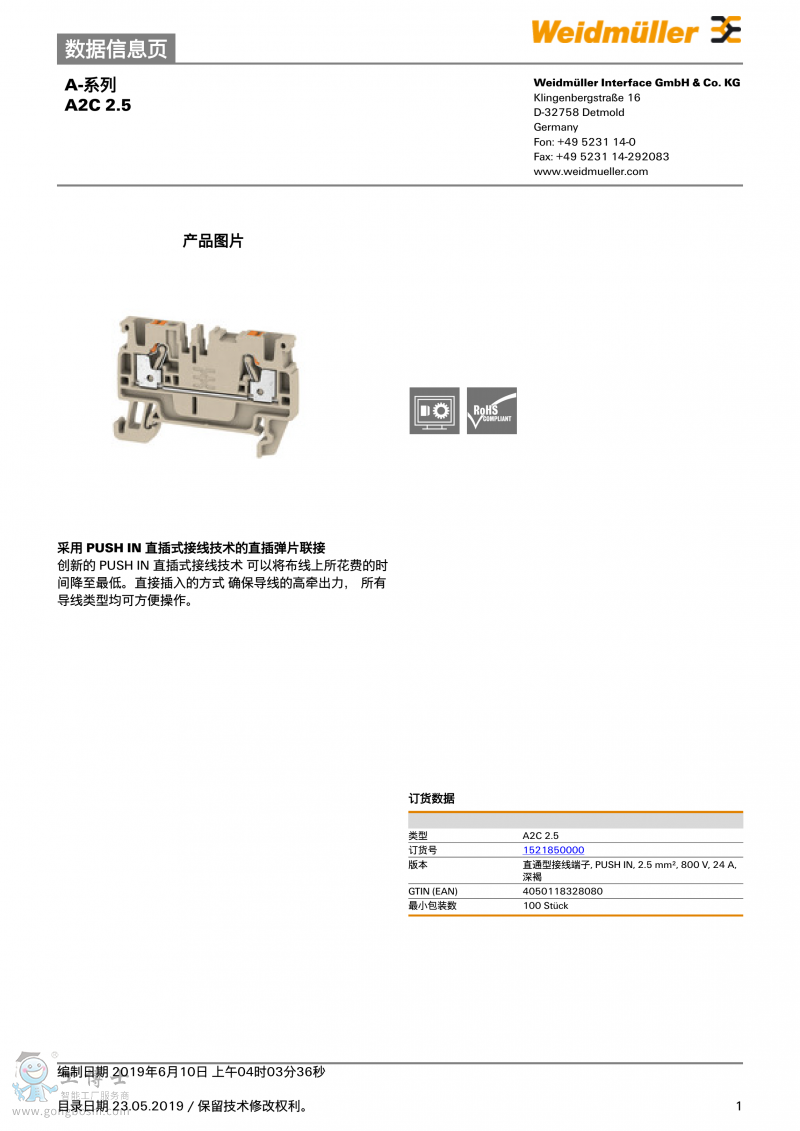 魏德米勒weidmulle直通型接線端子A2C 2.5訂貨號1521850000 |