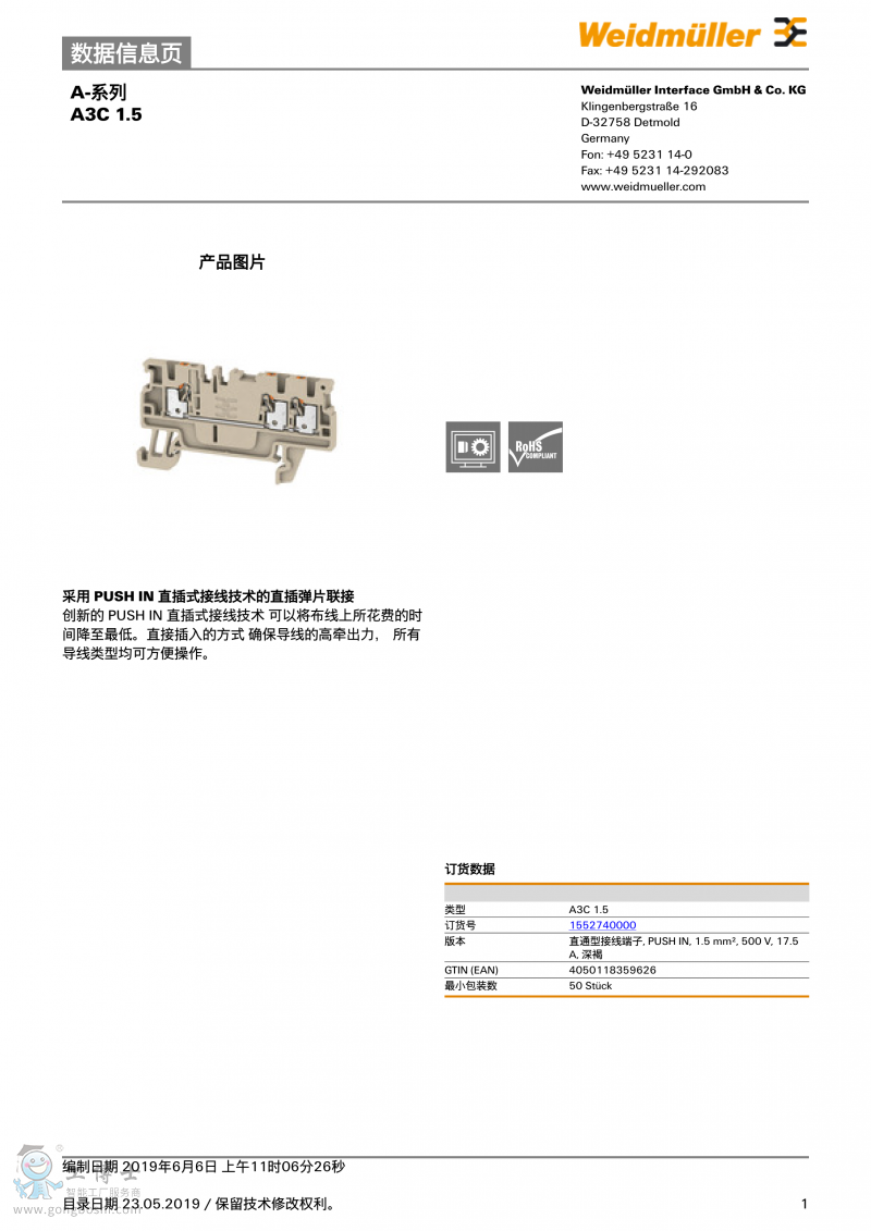 魏德米勒weidmulle直通型接線端子A3C 1.5訂貨號1552740000 |