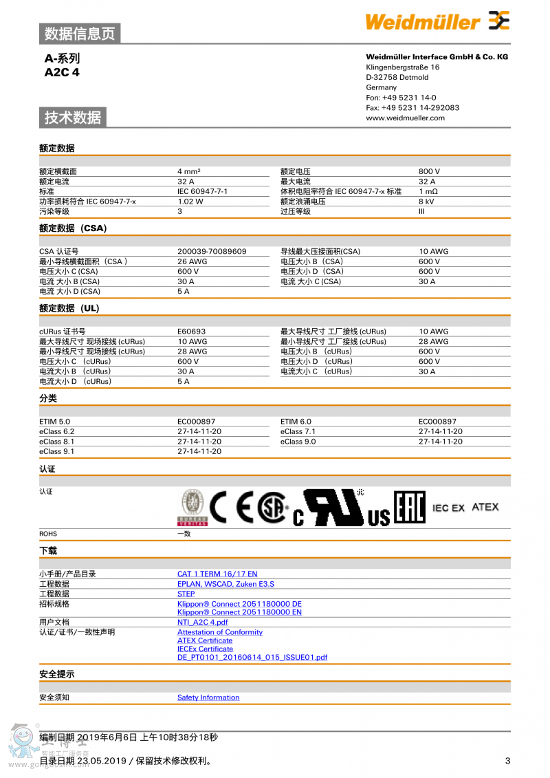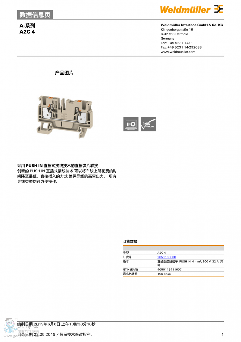 魏德米勒weidmulle直通型接線端子A2C 4訂貨號2051180000 |