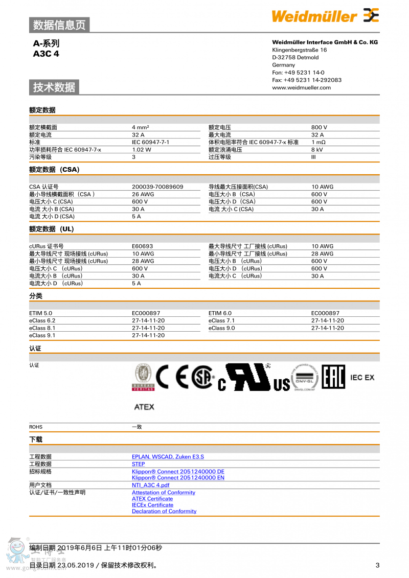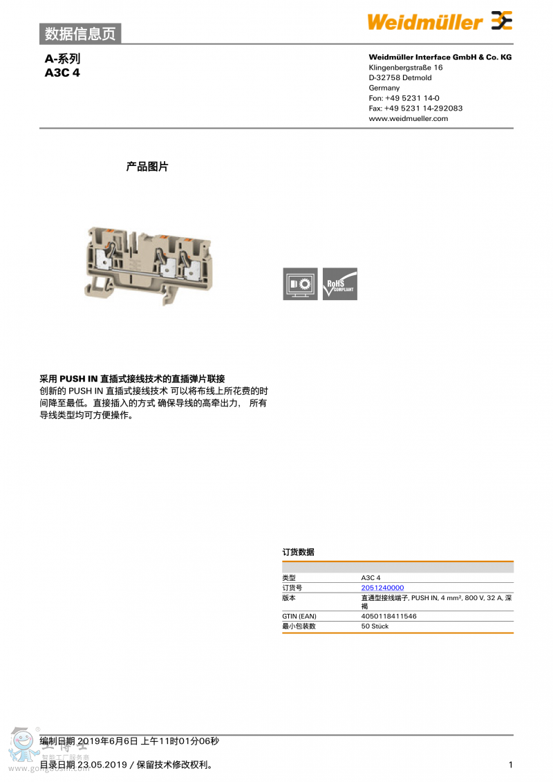 魏德米勒weidmulle直通型接線端子A3C 4訂貨號(hào)2051240000 |