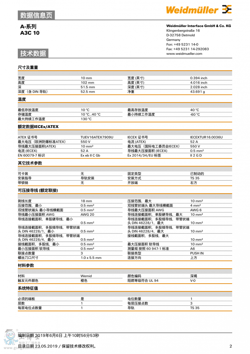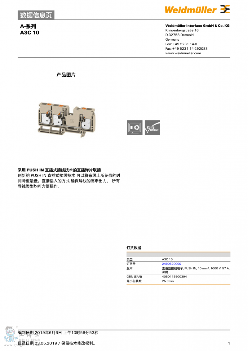 魏德米勒weidmulle直通型接線端子A3C 10訂貨號2490520000 |