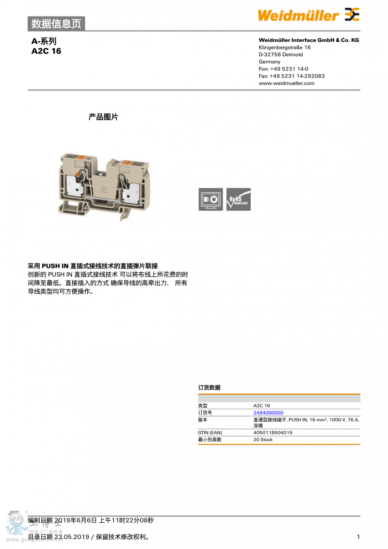 魏德米勒weidmulle直通型接線端子A2C 16訂貨號2494000000 |