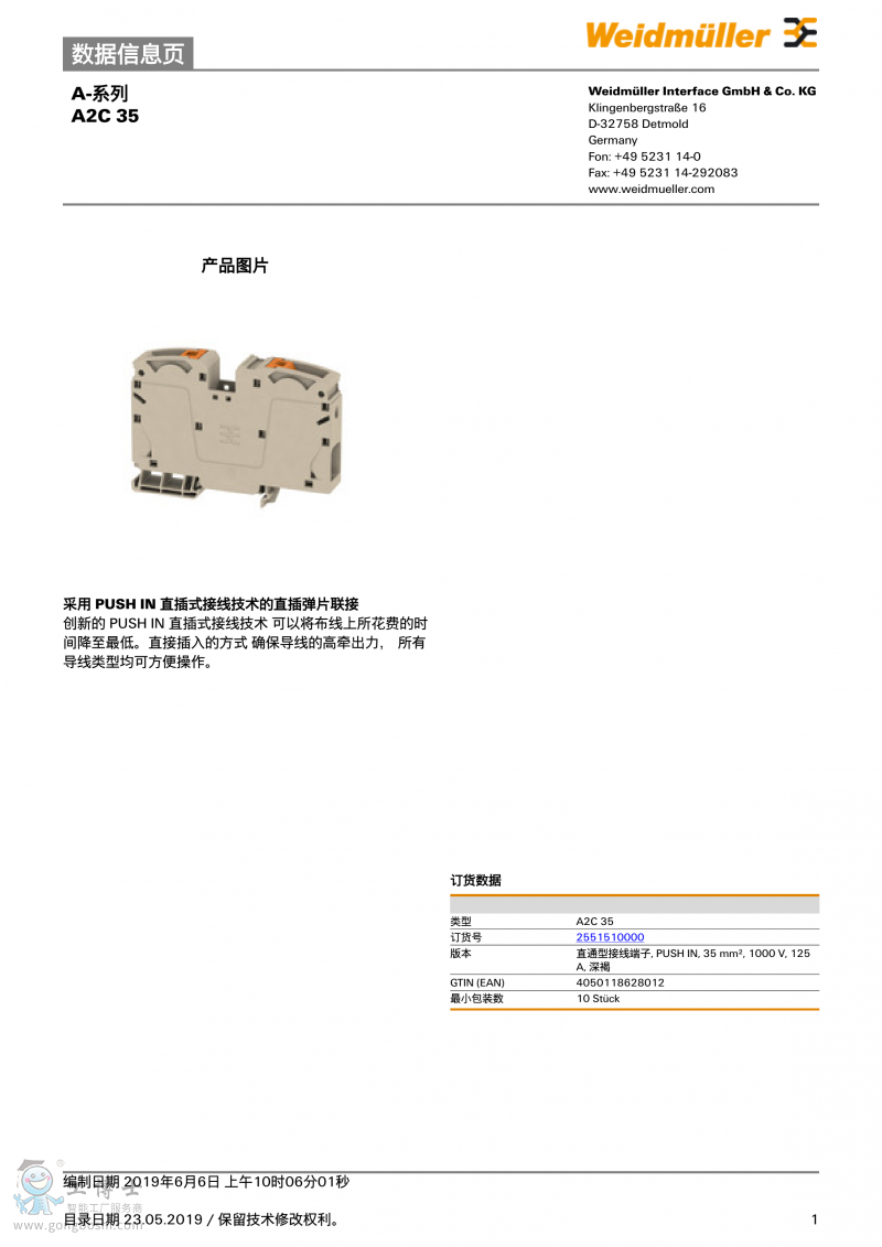 魏德米勒weidmulle直通型接線端子A2C 35訂貨號2551510000 |