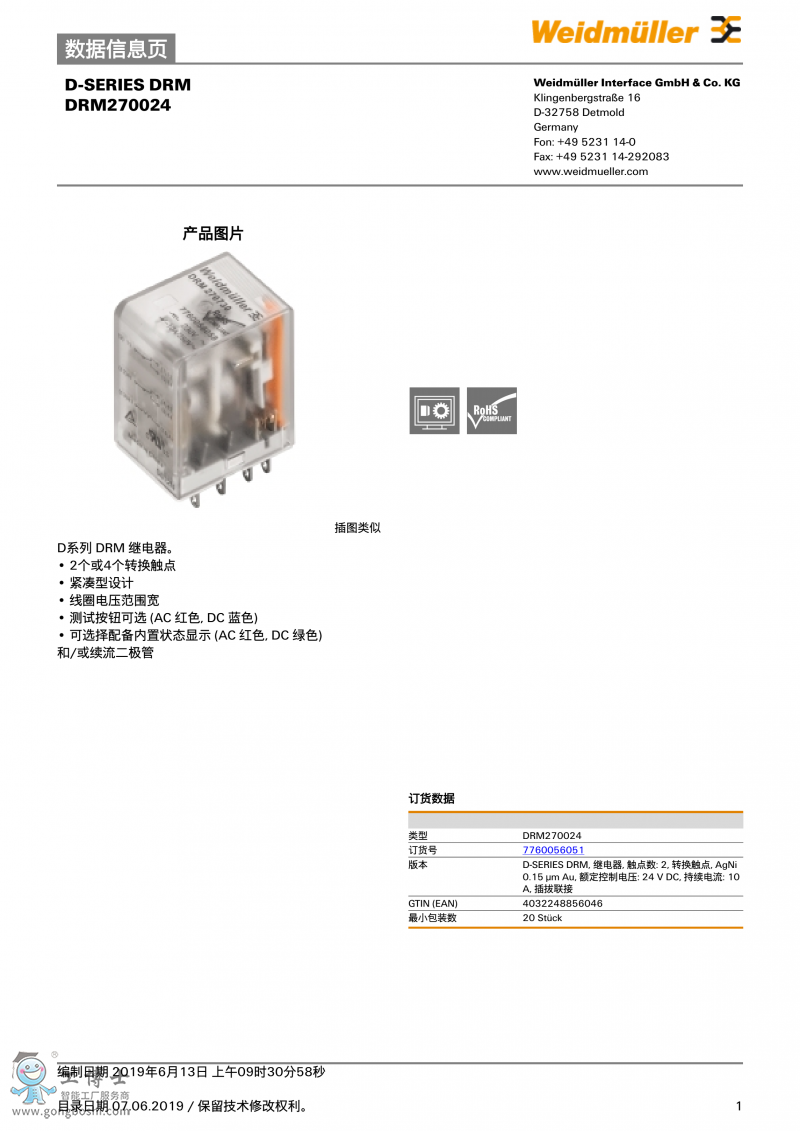 魏德米勒weidmulle標準繼電器DRM270024訂貨號7760056051 |