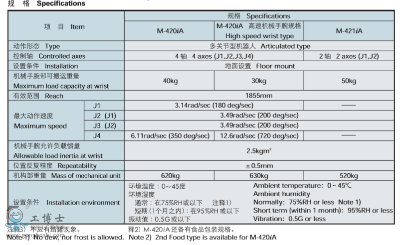 這是一款為物流系統的機器人化做出貢獻的物流智能機器人 可根據系統布局,選擇zui佳的軸配置類型。 FANUC Robot M-420iA: 4軸型 FANUC Robot M-421iA: 2軸型 具有*大3000次/小時的搬運能力。 通過活用*大50kg的可搬運能力,一次取出多個產品,從而提高 搬運作業效率。