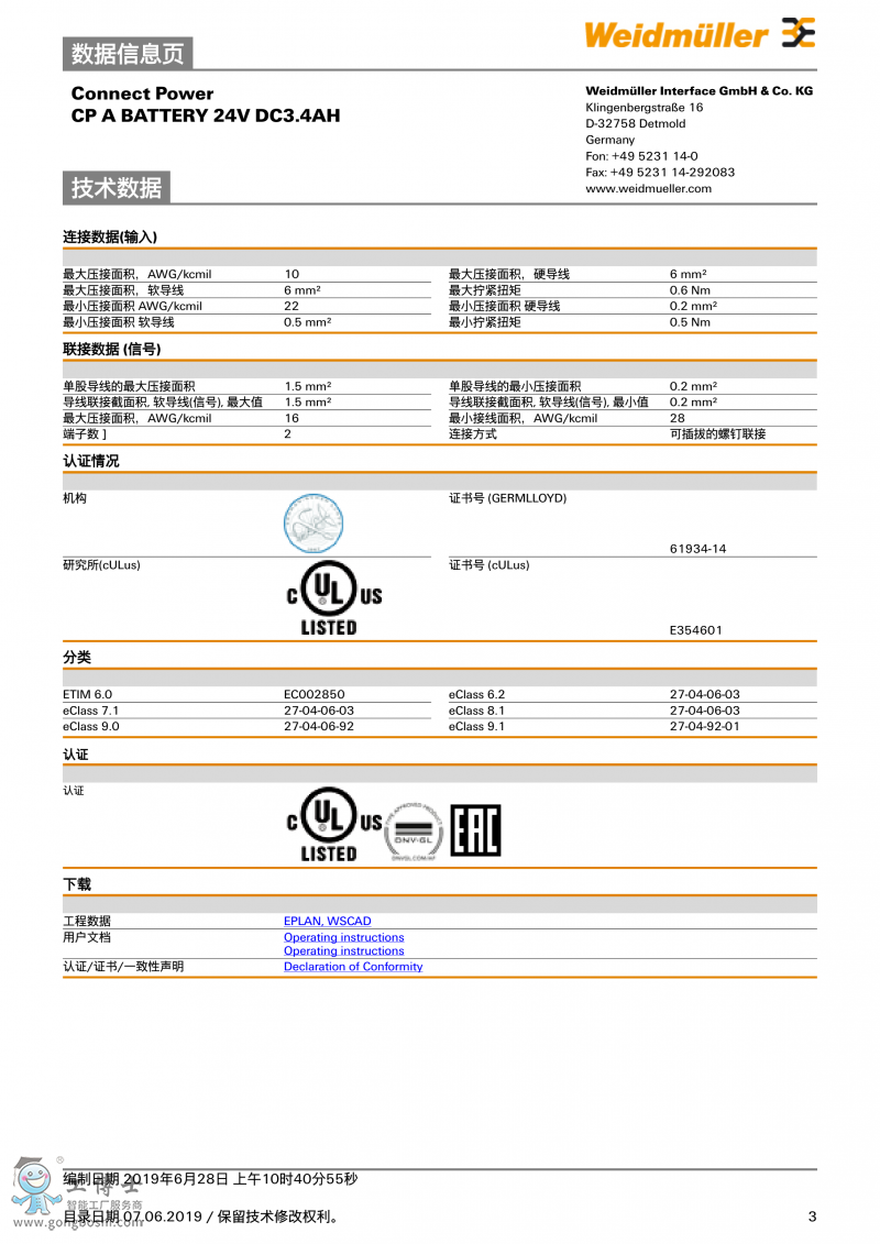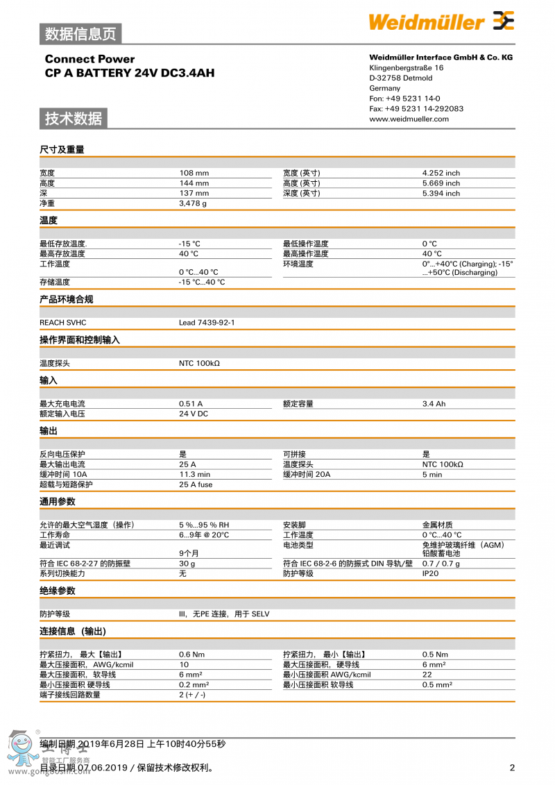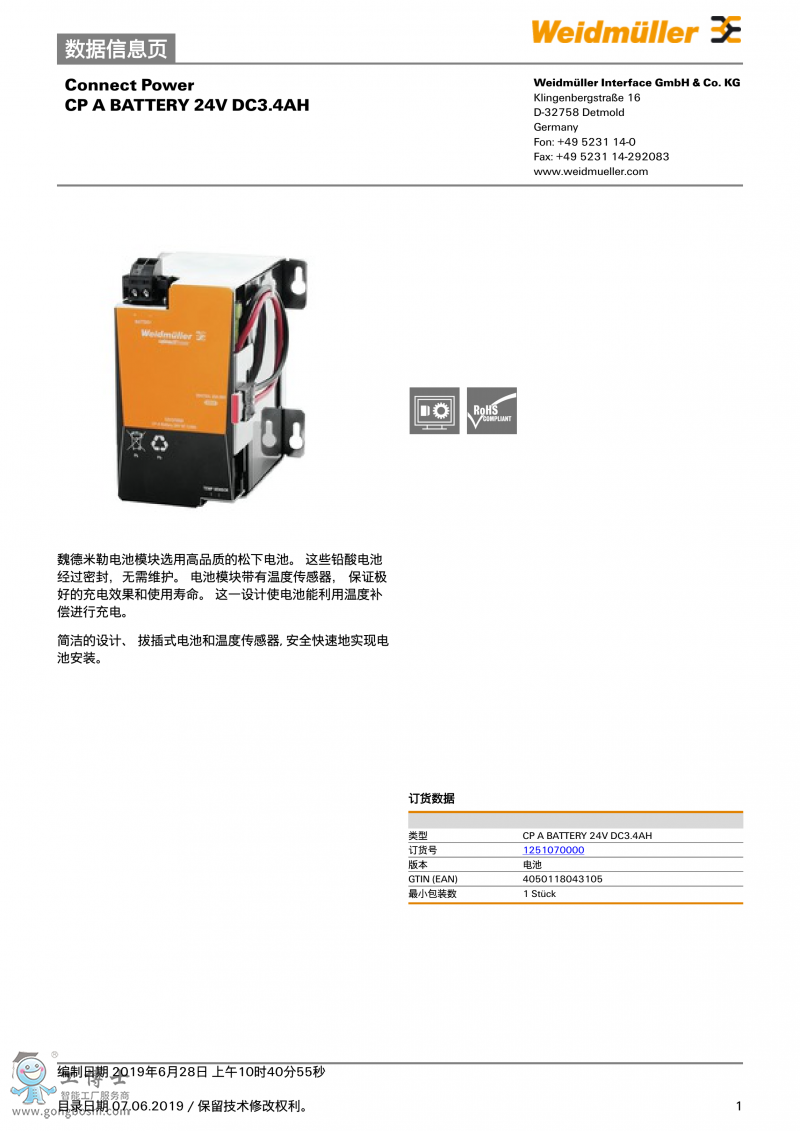 CP A BATTERY 24V DC3.4A魏德米勒 UPS電池 訂貨號1251070000 |
