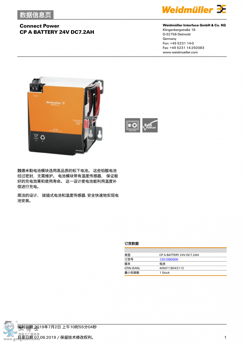 CP A BATTERY 24V DC7.2AH魏德米勒 UPS電池 訂貨號1251080000 |